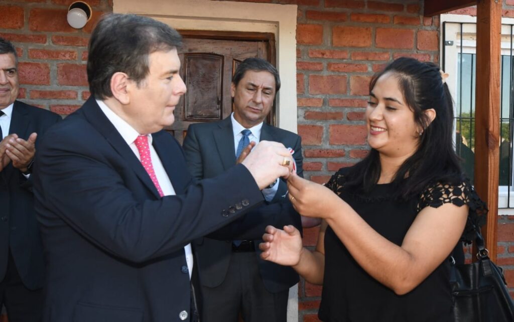 El corte de cintas y la entrega simbólica de llaves se realizó en el domicilio de Malena Cruz, donde el mandatario estuvo acompañado por el vicegobernador Carlos Silva Neder y los ministros de Educación, Mariela Nassif; de Obras Públicas, Aldo Hid, y de Desarrollo Social, Ángel Niccolai.
