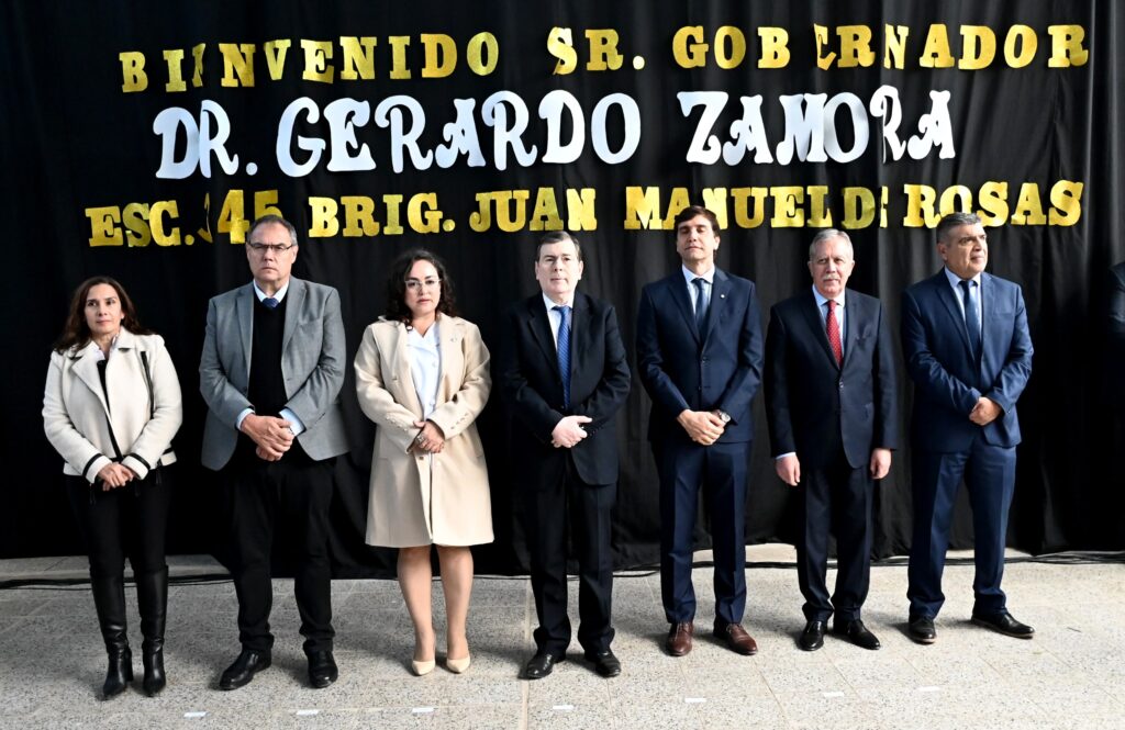 El gobernador Gerardo Zamora inauguró este lunes al mediodía las obras de ampliación y refacción de la Escuela N° 345 “Brigadier Juan Manuel de Rosas” de la localidad El Porvenir, oportunidad en la que también entregó viviendas sociales a 10 familias y anunció obras educativas para el departamento Río Hondo.