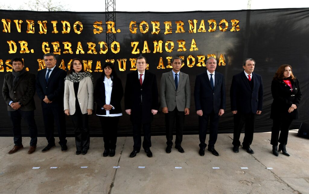 Zamora estuvo acompañado por el vicegobernador Carlos Silva Neder; el jefe de Gabinete, Elías Suárez, y los ministros de Educación, Mariela Nassif; de Desarrollo Social, Ángel Niccolai; de Obras Públicas, Aldo Hid, y de Producción, Miguel Mandrille. También el secretario de Obras Públicas, Jorge Zuaín, y la presidente del Consejo General de Educación, María Elena Herrera, junto con el comisionado local, Hugo Castillo.