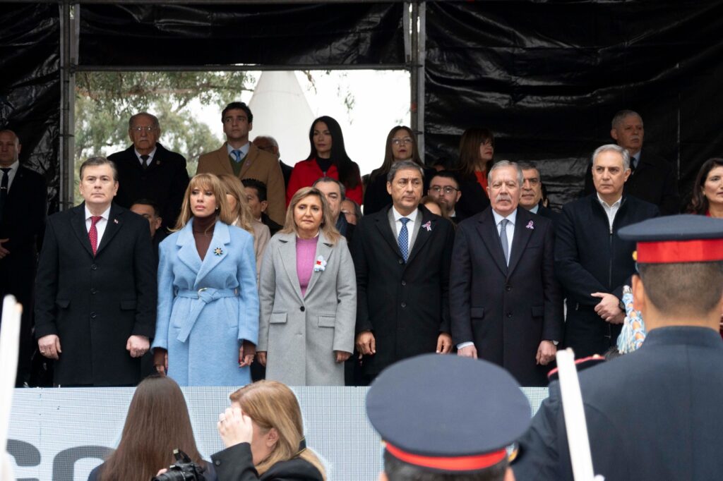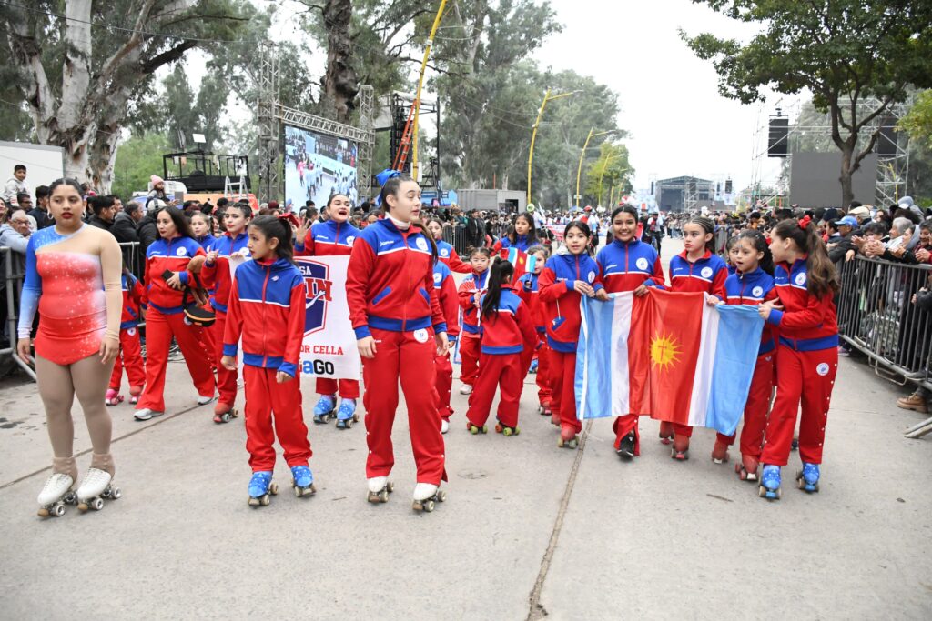 Estuvo acompañado en el palco por el vicegobernador Carlos Silva Neder; la senadora Claudia de Zamora; el jefe de Gabinete, Elías Suárez, la intendente Norma Fuentes y otras autoridades, más de 170 instituciones intermedias, fuerzas de seguridad, colectividades de inmigrantes, clubes de autos y motos y agrupaciones gauchas pusieron en escena un imponente despliegue.