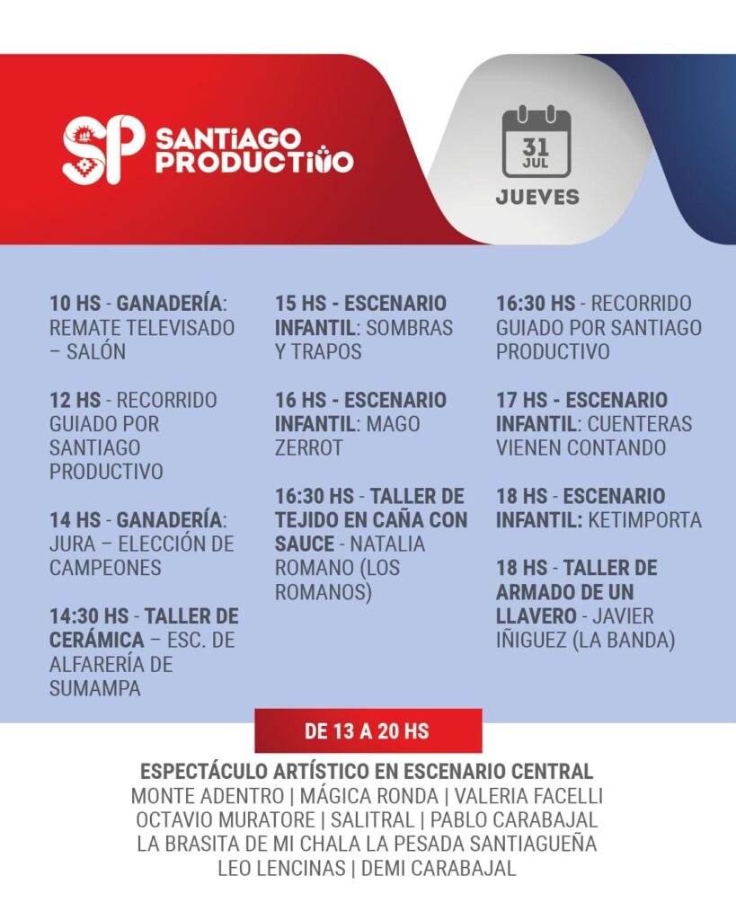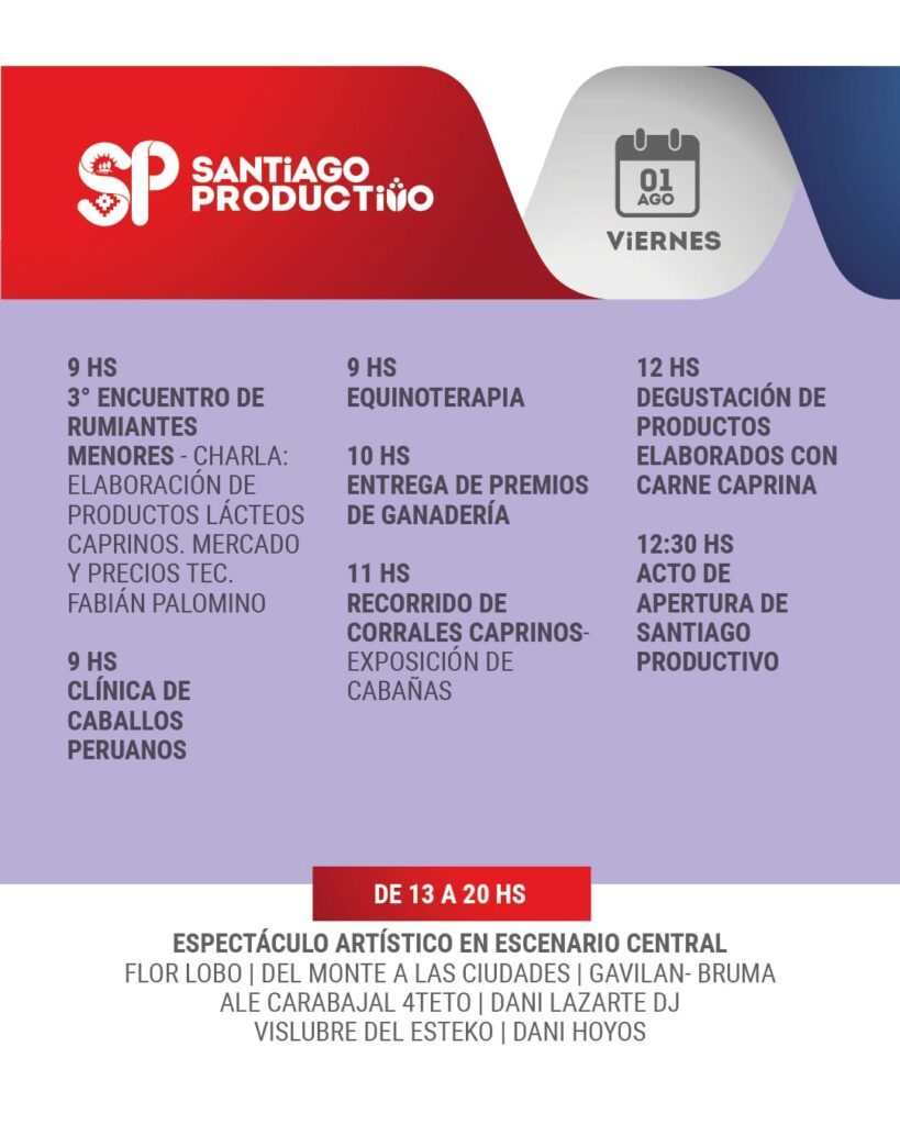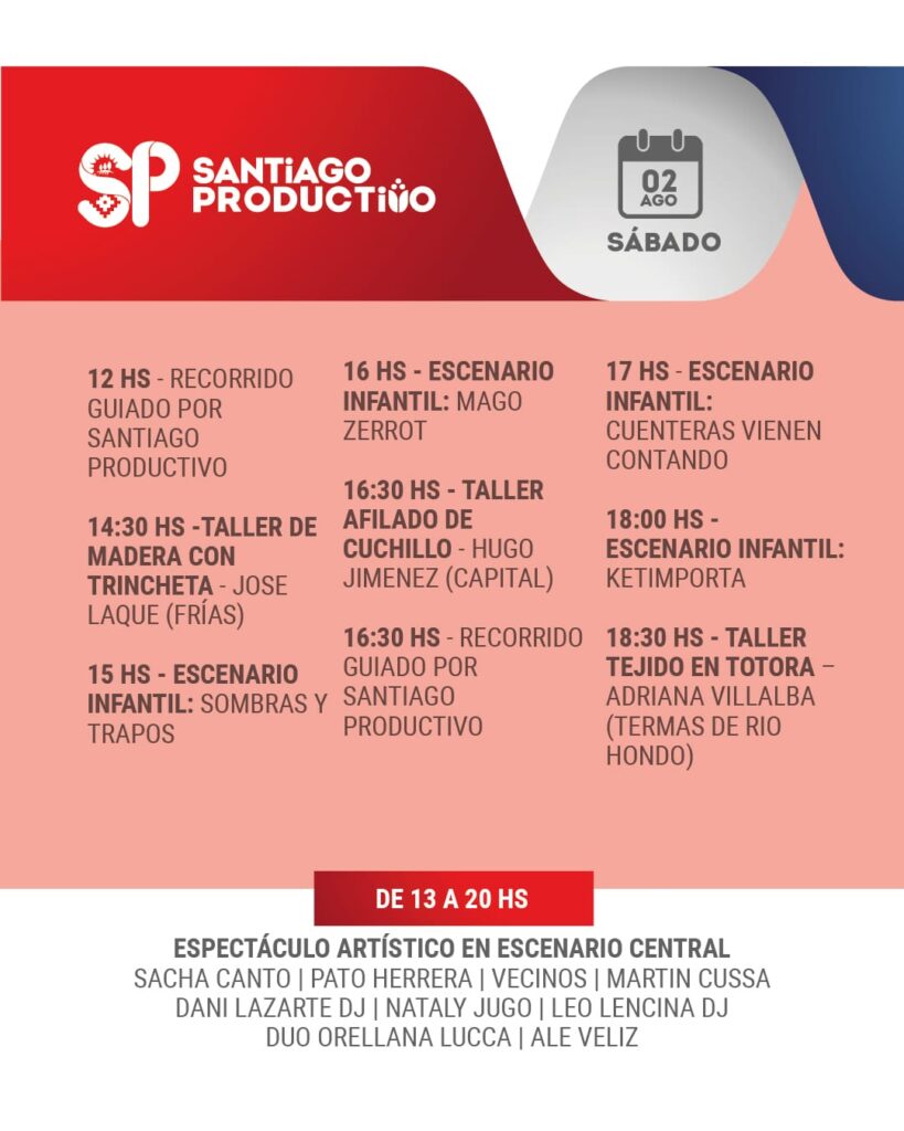 Desde mañana jueves 31 de julio y hasta el sábado 2 de agosto, el Vivero San Carlos de La Banda será escenario de una nueva edición de “Santiago Productivo”, una propuesta del Gobierno de la Provincia que busca poner en valor el esfuerzo de trabajadores, emprendedores, cooperativas y pymes de todo el territorio santiagueño.