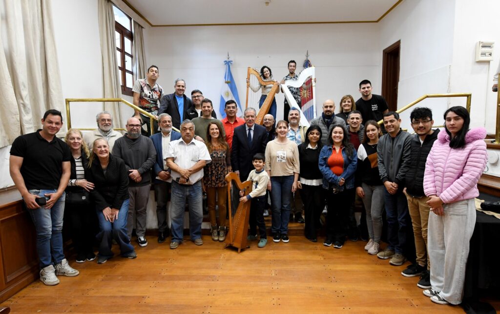 El jefe de Gabinete, Elías Suárez, recibió este jueves por la mañana en Casa de Gobierno a artistas que participarán del 21° Encuentro Latinoamericano Mishquila de Arpas, que se realizará del 20 al 23 de agosto con conciertos en el Centro de Convenciones Fórum y en el Teatro 25 de Mayo.